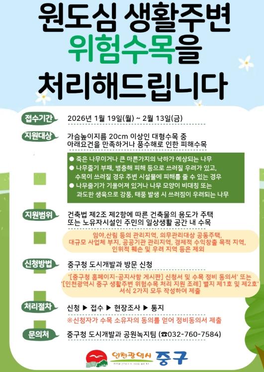 [한국제일신문, 김성옥기자] 인천시 중구는 원도심 권역을 대상으로 ‘2026년도 원도심 생활 주변 위험 수목 처리지원 사업’을 추진한다고 21일 밝혔다.