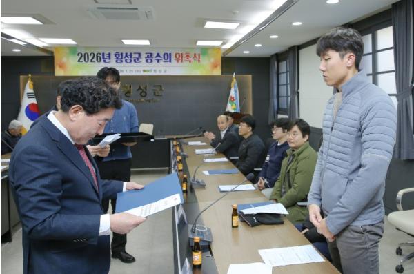 [한국제일신문, 김성광기자] 횡성군은 1. 21. 군청 2층 소회의실에서 ‘2026년 공수의 위촉식’을 개최하고, 가축 전염병 예방을 위한 본격적인 활동에 들어갔다고 밝혔다. 이번에 위촉되는 공수의는 13명으로 이는 강원특별자치도 내 시‧군 중 가장 많은 인원이다.