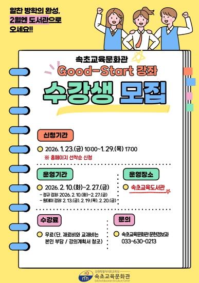 속초교육문화관(관장 이윤전)은 2월 10일부터 27까지 10일간 속초교육도서관에서 예비 초·중·고등학생, 초등 가족을 대상으로 ‘2026년 굿 스타트(Good-Start) 강좌’를 운영한다.