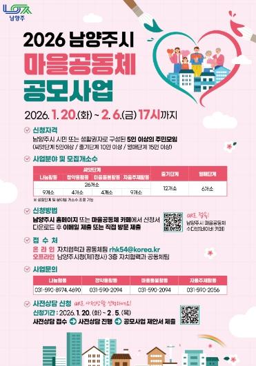 [한국제일신문, 임동일기자] 남양주시는 1월 20일부터 2월 6일까지 ‘2026년 마을공동체 공모사업’참여 공동체를 공개 모집한다.