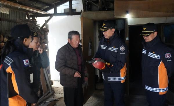 이날 현장에는 한창완 서장을 비롯한 소방공무원 5명과 인안2리 마을이장이 함께했으며, 화목보일러 안전관리 실태 점검과 함께 화재 예방 교육, 소화기 사용법 안내 및 소화기 전달이 이루어졌다.