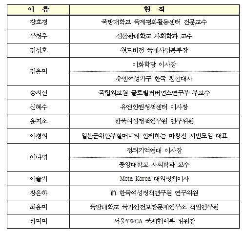 [한국제일신문, 김성옥기자] '여성과 함께하는 평화 구상(Action with Women and Peace Initiative)' 2기 자문위원회가 1월 21일 출범했다. 금번에 출범한 2기 자문위원회는 여성‧평화‧안보, 인권, 개발협력, 사이버 등 분야에서 활동 중인 13명의 학계, 시민사회 등 민간 전문가로 구성되어 앞으로 동 구상 추진 과정에서 다양한 자문을 제공하게 된다.