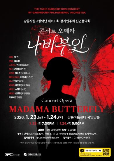 [한국제일신문, 김성옥기자] 강릉시립교향악단은 2026년의 첫 정기연주회로 오는 23일(금) 19시 30분, 24일(토) 17시 강릉아트센터 사임당홀에서 콘서트 오페라‘나비부인’을 선보인다.