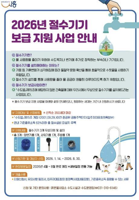 [한국제일신문, 홍영진기자] 시흥시는 물 절약 문화를 확산하기 위해 ‘2026년 절수기기 보급 지원사업’을 본격적으로 추진한다. 올해는 작년보다 지원 대상을 넓혀 관내 저소득 취약계층까지 총 350세대에 가구당 절수기기 3종(양변기용ㆍ주방용ㆍ샤워기용)을 무상으로 지원한다.