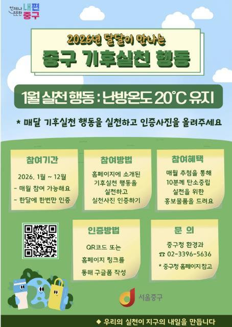 [한국제일신문, 김성옥기자] 서울 중구가 올해부터 '달달이 기후실천 행동'을 운영하며 주민들의 녹색생활 실천의지를 북돋는다. 올해 첫 미션은 ‘난방온도 20℃ 유지하기’고, 다음달 미션은 '대중교통 이용하기'다.