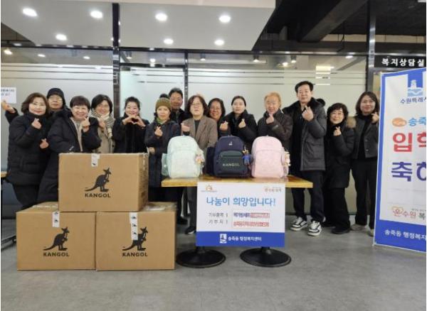 [한국제일신문, 김성옥기자] 수원시 장안구 송죽동 지역사회보장협의체가 지난 21일 송죽동 행정복지센터에서 2026년 초등학교 입학을 앞둔 저소득 가정 아동 9명을 대상으로 ‘입학아동 책가방 지원 사업’을 추진했다.