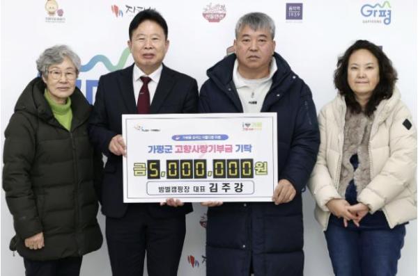 군에 따르면 설악면 밤벌캠핑장 대표 김주강 씨와 사위 조중혁 씨가 21일 가평군청을 방문해 고향사랑기부금 500만 원을 기탁했다.