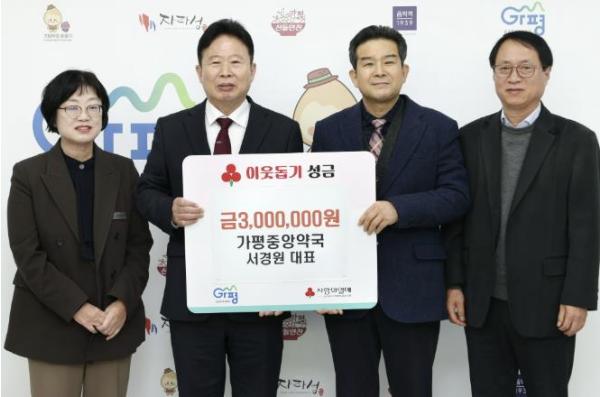 [한국제일신문, 김성옥기자] 가평중앙약국 서경원 대표는 21일 이웃돕기 성금 300만원을 가평군에 기탁하며 지역사회 나눔 실천에 동참했다.