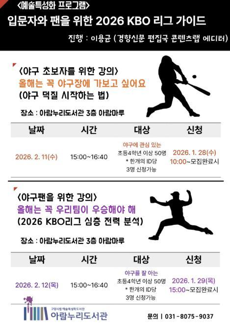 [한국제일신문, 이양섭기자] 고양특례시 아람누리도서관은 오는 2월 11일과 12일 오후 3시부터 4시 40분까지 예술특성화 프로그램‘입문자와 팬을 위한 2026 KBO 리그 가이드’를 운영한다.