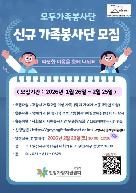 [한국제일신문, 이양섭기자] 고양특례시 건강가정지원센터에서는 오는 2월 25일까지 2026년 ‘가족봉사단’참여자를 모집한다.