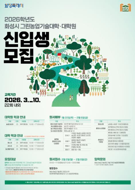 [한국제일신문, 김성옥기자] 화성특례시가 화성 농업을 이끌어갈 유능한 인재를 발굴해 집중 교육하기 위한 ‘2026년도 그린농업기술대학(원)’ 신입생을 모집한다고 22일 밝혔다.