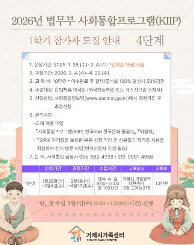 [한국제일신문, 김성옥기자] 거제시가족센터는 이민자의 안정적인 지역사회 정착과 자립을 지원하기 위해 2026년도 법무부 사회통합프로그램(Korea Immigration & Integration Program, KIIP) 1학기 참여자를 모집한다고 밝혔다.