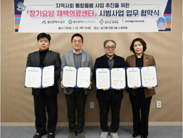 [한국제일신문, 김성옥기자] 울산 남구는 지역 내 거동불편 어르신들의 건강한 재가생활 지원을 위해 22일 남구청에서 굿모닝한의원, 아주재활의학과의원, 보건소 등과 ‘장기요양 재택의료센터’ 시범사업 업무협약식을 개최했다.