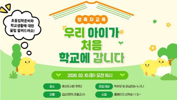 이번 강연은 초등학교 입학을 앞둔 아동의 양육자가 입학 전 준비 사항과 학교생활 전반을 체계적으로 이해할 수 있도록 돕기 위한 것으로, 22년 차 현직 초등 교사이자 '우리 아이가 처음 학교에 갑니다' 저자인 김선 강사가 진행한다.