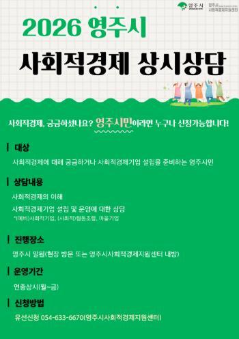 [한국제일신문, 김성옥기자] 영주시와 영주시사회적경제지원센터는 사회적경제에 대한 시민들의 이해를 높이고 신규 사회적경제기업 발굴을 지원하기 위해 ‘2026 영주시 사회적경제 상시상담’을 연중 운영한다고 밝혔다.