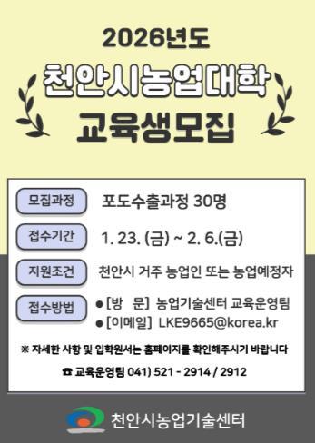[한국제일신문, 김성옥기자] 천안시농업기술센터는 내달 6일까지 ‘2026년도 천안시농업대학’ 교육생 30명을 모집한다고 23일 밝혔다.