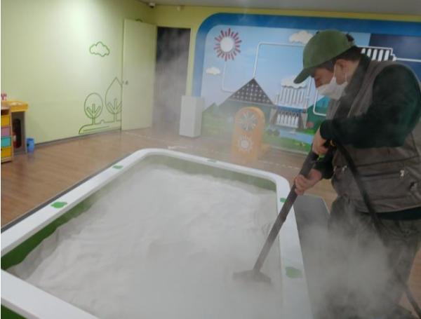 유아의 건강을 고려해 화학 약품 사용을 최소화하고, 고온 스팀을 활용해 인체에 무해한 방식으로 소독을 진행했으며, 특히 유아들의 손이 많이 닿고 이용 빈도가 높은 실내 놀이·체험 공간 전반에 걸쳐 집중적으로 방역을 마쳤다.