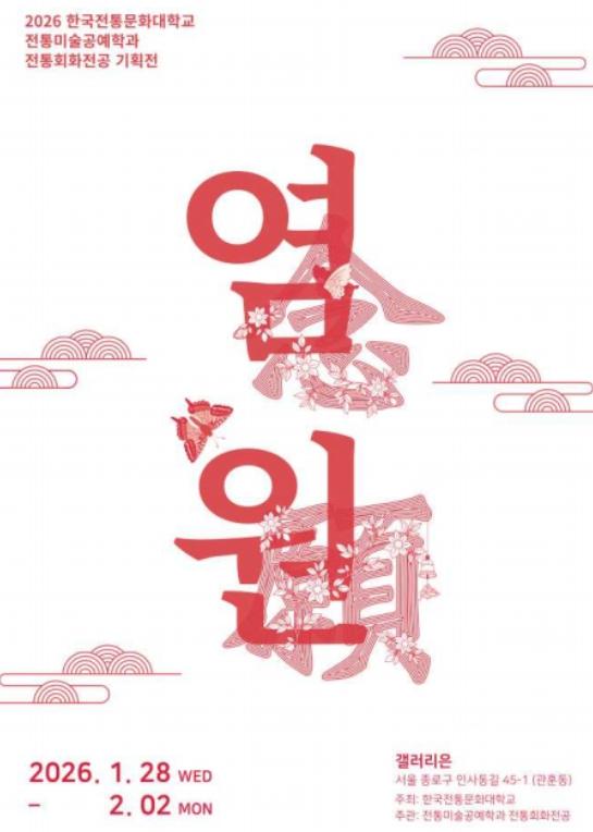 [한국제일신문, 김성옥기자] 국가유산청 한국전통문화대학교는 1월 28일부터 2월 2일까지 갤러리 은(서울 종로구)에서 전통미술공예학과 전통회화전공 재학생 42명과 교수진이 전통기법과 재료를 바탕으로 제작한 전통회화 작품들을 선보이는 기획전시 '염원(念願)'을 개최한다.
