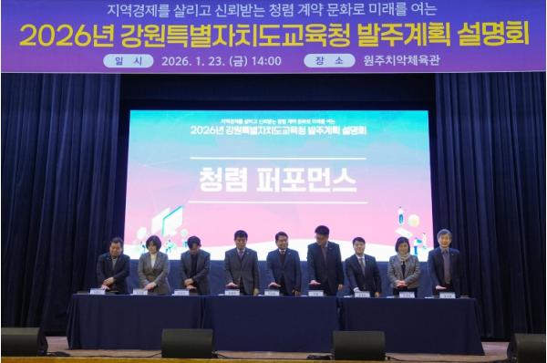 [한국제일신문, 김성옥기자] 강원특별자치도교육청은 23일 원주 치악체육관에서 청렴한 계약문화 확산과 지역경제 상생을 위한 ‘2026년 공사·용역·물품 발주계획 설명회’를 개최했다.