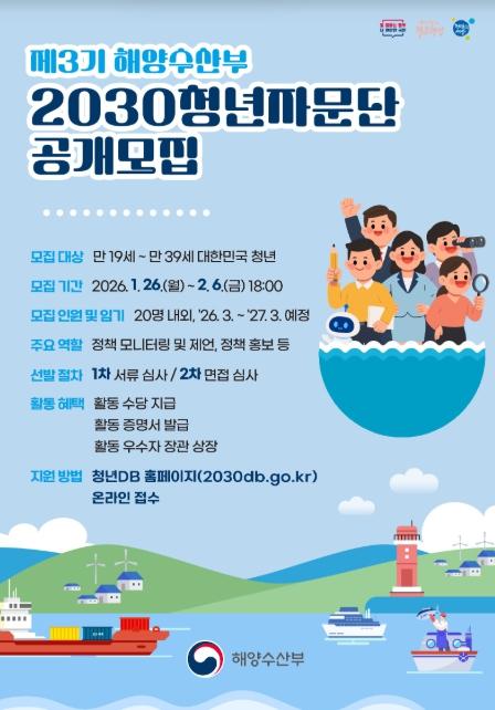 [한국제일신문, 김성옥기자] 해양수산부는 해양수산 정책 전반에 대한 청년세대의 다양한 의견을 수렴하고 청년들의 정책 참여 기회를 확대하기 위해 1월 26일부터 2월 6일까지 ‘제3기 해양수산부 2030청년자문단’을 공개 모집한다고 밝혔다.