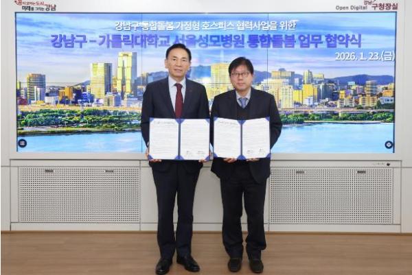 [한국제일신문, 김성옥기자] 꿈이 모이는 도시, 미래를 그리는 강남구가 1월 23일 구청에서 가톨릭대학교 서울성모병원과 ‘강남구 통합돌봄 가정형 호스피스 협력사업’ 추진을 위한 업무협약(MOU)을 체결했다. 이 협약은 자치구와 상급종합병원이 연계해 가정형 호스피스를 지원하는 체계를 공식화했다는 점에서 그 의미가 크다.