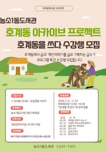 농소1동도서관 관계자는 "변화하고 있는 호계동의 오래된 골목길, 시장, 호계역, 지역 주민의 생활상 등을 글과 그림, 사진으로 기록해 주민들의 삶과 기억을 체계적으로 보존하고자 한다"며 "이번 프로젝트를 통한 기록물이 모든 세대를 아우르는 지역의 문화자산이 되기를 기대한다"고 말했다.