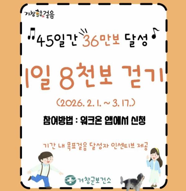 [한국제일신문, 김성옥기자] 거창군은 오는 2월 1일부터 3월 17일까지 거창군민을 대상으로 신체활동 증진과 생활 속 걷기 실천 활성화를 위해 '거창韓걸음'1차 챌린지를 운영한다.