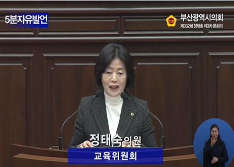 [한국제일신문, 김성옥기자] 부산광역시의회 교육위원회 정태숙 의원(국민의힘, 남구2)은 1월 26일 열린 제333회 임시회 제1차 본회의 5분 자유발언을 통해, 황령산 생태숲에 조성된 ‘김소월 시와 함께 하는 길’에 이어서 머무를 수 있는 ‘K-문학 향유 공간 조성’이 필요하다고 강조했다.