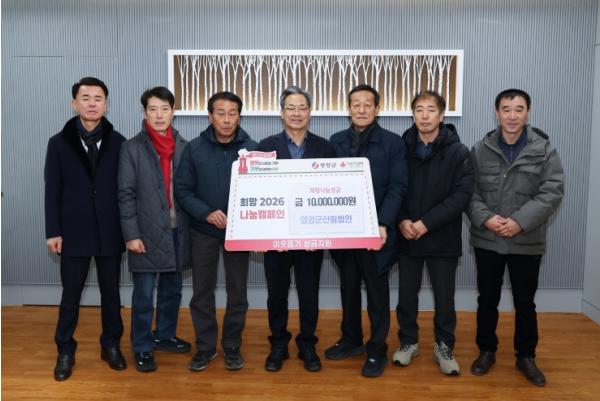 [한국제일신문, 김성옥기자] 영양군 관내 산림사업 법인 6개사가 1월 26일 영양군청을 합동 방문해, 어려운 이웃을 위한 '희망2026나눔캠페인' 성금 1,000만원을 전달하며 지역사회에 훈훈한 감동을 전했다.