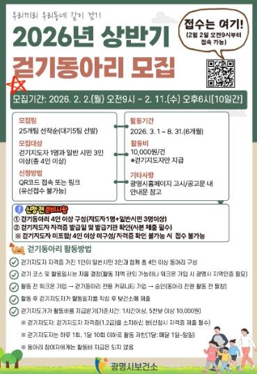 [한국제일신문, 홍영진기자] 광명시가 시민의 건강 증진과 일상 속 걷기 문화 확산을 위해 오는 2월 2일부터 11일까지 ‘2026년 상반기 걷기동아리’ 참가팀을 모집한다.