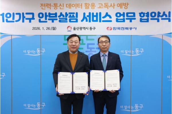 [한국제일신문, 김성옥기자] 울산 동구는 1월 26일 오후 3시 30분 ‘1인가구 안부살핌 서비스’ 사업 추진을 위해 한국전력공사와 업무 협약을 체결했다.