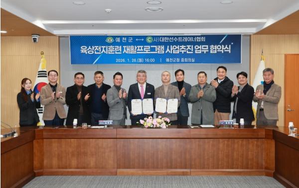 [한국제일신문, 김성옥기자] 예천군은 26일 오후 4시 군청 중회의실(3층)에서 (사)대한선수트레이너협회와 ‘육상전지훈련 재활프로그램 사업추진을 위한 업무협약(MOU)’을 체결했다고 밝혔다.