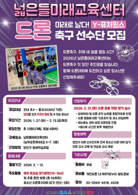 [한국제일신문, 김영배기자] 양천구는 드론 주행 기술과 스포츠를 결합한 유소년 드론축구단 ‘Y-퓨처윙스’를 창단하고, 하늘 위에서 펼쳐지는 짜릿한 승부를 함께 경험할 창립 멤버를 오는 2월 13일까지 모집한다고 밝혔다.