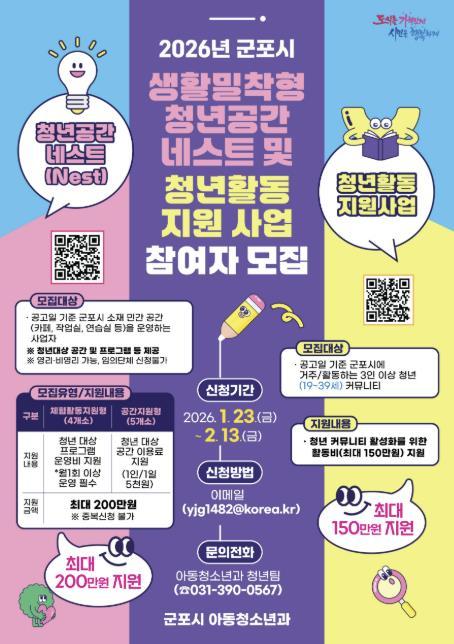 접수기간은 각각 2월 13일까지며 자세한 사항은 군포시 홈페이지(열린시정 ' 군포알리미 ' 고시공고)를 참고하거나 아동청소년과 청년팀로 문의하면 된다.