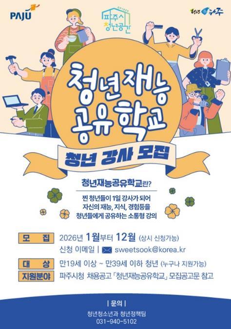 [한국제일신문, 김성옥기자] 파주시는 2026년 1월부터 12월까지 청년을 대상으로 '청년재능공유학교' 청년강사를 연중 상시 모집한다.