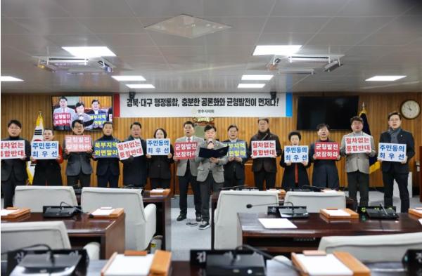 영주시의회 의원 일동은 성명서 발표가 끝난 후 “도민 동의 없는 행정통합은 정당성을 가질 수 없다”며, “도민의 삶과 지역의 미래를 지키기 위해 민주적 절차와 균형 발전 원칙이 관철될 때까지 행정통합 추진에 단호히 맞설 것”이라고 밝혔다.