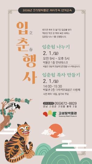 고성탈박물관 관계자는 “새해를 맞아 건강하고 행복한 한 해를 보내길 바라는 전통 세시풍속을 함께 나누기 위해 행사를 열게 됐다”라며, “이번에 전면 리모델링을 한 박물관도 구경하고 입춘첩도 만들어보는 가족 프로그램에도 많은 참여를 바란다”라고 밝혔다.