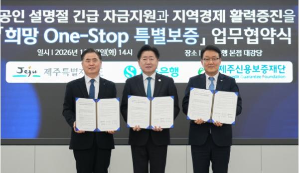 제주도는 27일 제주은행 본점에서 제주은행, 제주신용보증재단과 함께 소상공인 설명절 긴급 자금지원과 지역경제 활력 증진을 위한 ‘희망 원스톱(One-Stop) 특별보증’ 업무협약을 체결했다.