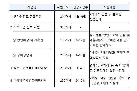이번 사업의 총 지원 규모는 141억 7천만 원이며, 주요 지원 프로그램은 ①온라인 판로지원, ②오프라인 판로지원, ③중소기업제품 전용판매장 운영, ④마케팅 역량강화 프로그램 등이다.