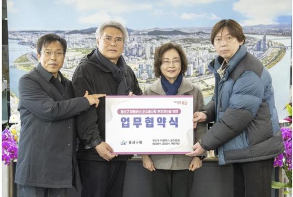 이날 협약식에는 박희영 용산구청장을 비롯해 남산운수·금양운수·태영교통 등 지역 마을버스 운수업체 대표들이 참석해 협약서를 교환하고 기념촬영을 했다.