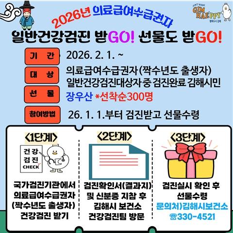 [한국제일신문, 김성옥기자] 김해시보건소는 2026년 새해를 맞아 의료 취약계층의 질병을 조기에 발견하고 예방하기 위해 의료급여수급권자를 대상으로 『일반건강검진 받GO! 선물도 받GO!』 이벤트를 실시한다고 밝혔다.