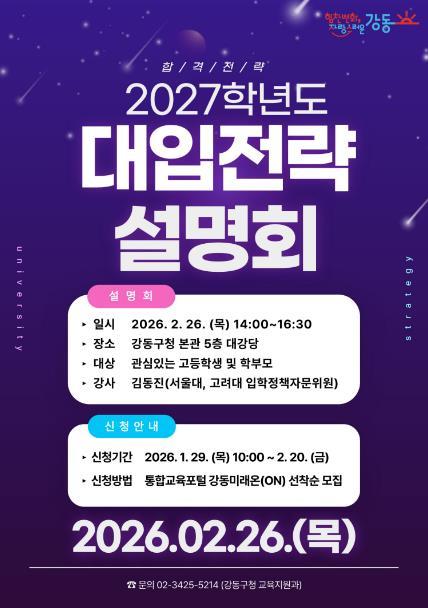 [한국제일신문, 김성옥기자] 서울 강동구가 2027학년도 대학입학전형에 대비한 올해 첫 대입전략설명회를 오는 2월 26일 강동구청 5층 대강당에서 개최한다고 28일 밝혔다.