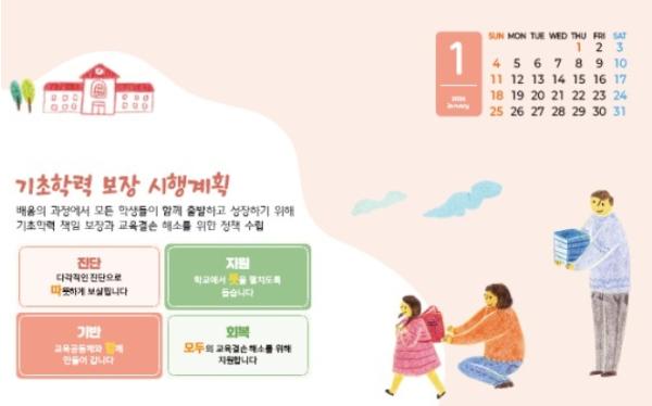 달력에는 △기초학력 보장 시행계획 △교원학습공동체 △질문이 넘치는 교실・우리 집 △아우름 교육과정 △경북형 인성교육 △수업보듬이 △유・초 이음교육 △공정하고 합리적인 인사관리 △영유아 정서・심리지원 △경북학생성장지원평가 △유보통합(온맘미소) 등 경북 유・초등교육의 주요 정책과 핵심 사업이 월별로, 체계적으로 담겨 있다.