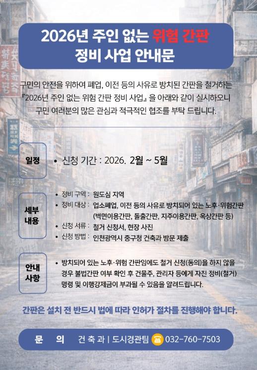 [한국제일신문, 김성옥기자] 인천시 중구는 도시 미관을 해치고 안전사고 우려가 있는 노후·방치 간판을 정비하기 위해 ‘2026년도 주인 없는 위험 간판 정비사업’을 본격 추진한다고 28일 밝혔다.