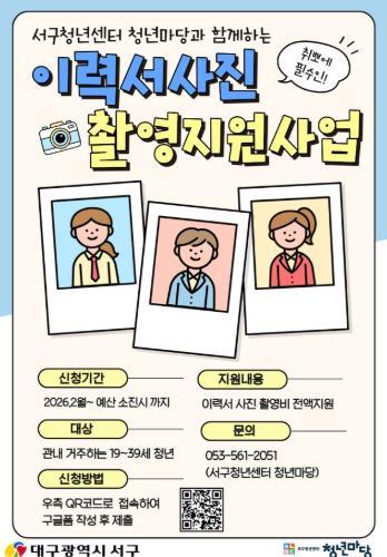 [한국제일신문, 김성옥기자] 대구 서구는 관내 청년 구직자의 경제적 부담을 줄이고 안정적인 사회 진출을 지원하기 위해 ‘이력서 사진 촬영 지원 사업’과 ‘취업 면접실(AI 모의 면접) 운영 사업’을 실시한다고 밝혔다.