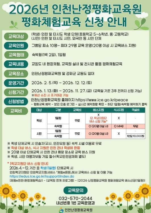 [한국제일신문, 김성옥기자] 인천광역시교육청난정평화교육원은 2월 5일부터 12월 12일까지 학생과 시민을 대상으로 ‘2026년 평화체험교육’을 운영한다.
