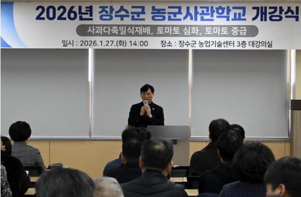 [한국제일신문, 김성관기자] 장수군은 지난 27일 농업기술센터 대강의실에서 교육생 130여 명이 참석한 가운데 ‘2026년 장수군 농군사관학교 개강식’을 성황리에 개최했다.