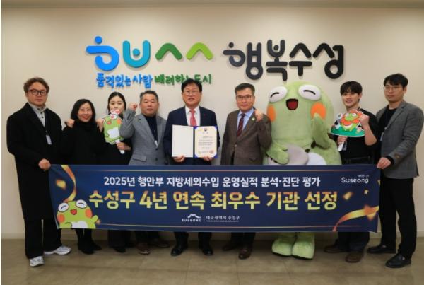 [한국제일신문, 김성옥기자] 대구 수성구는 행정안전부가 주관한 ‘2025년 지방세외수입 운영실적 분석 진단’ 평가에서 최우수 기관으로 4년 연속 선정됐다고 밝혔다.