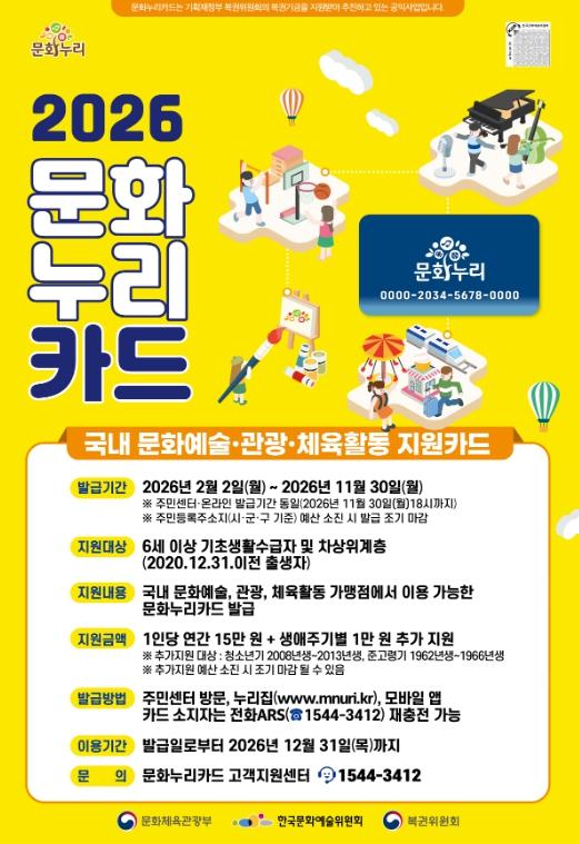 지난해 문화누리카드 발급자가 금년에도 수급자격을 유지하는 경우, 별도의 신청절차 없이 보유한 카드에 지원금이 자동 지급됐으며, 신규대상자는 2월 2일부터 읍・면・동 행정복지센터 또는 인터넷 누리집, 모바일 앱, ARS로 신청하면 된다.