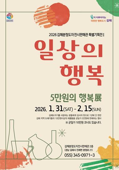 [한국제일신문, 김성옥기자] 김해시는 오는 31일부터 2월 15일까지 김해분청도자전시판매관에서 ‘일상의 행복, 5만원 행복展’을 개최한다.